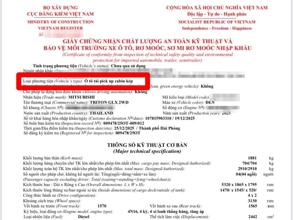Mở ngay Sổ đăng kiểm: Chỉ duy nhất dòng chữ ở mục Loại phương tiện (“Ô tô con Pickup” hoặc “Ô tô tải Pickup”) mới là câu trả lời chính xác và hợp pháp nhất.